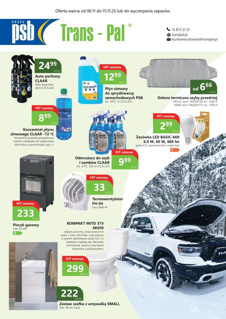 Zapraszamy do zapoznania się z się z naszą ofertą promocyjną Trans-Pal - PSB Mrówka: Janów Lubelski, Kraśnik, Krasnystaw, Chełm, Leżajsk – która obowiązuje od 06.11.2025 do 15.11.2025 lub do wyczerpania zapasów.